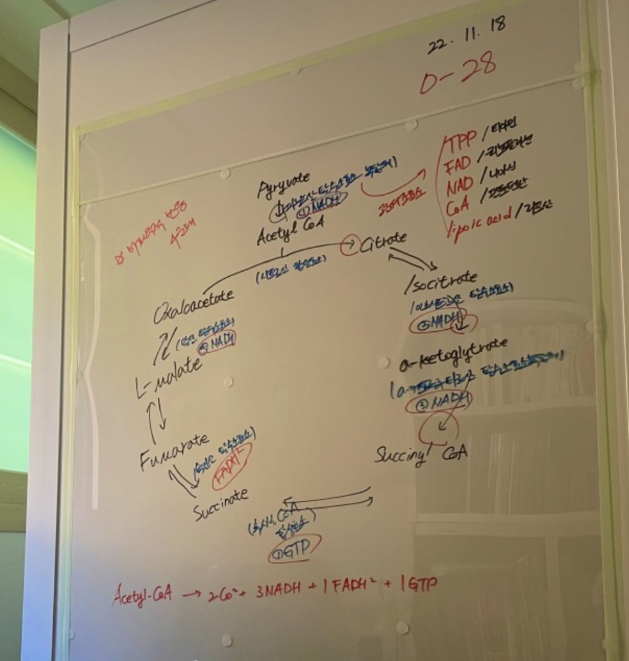 저는 재학 중에 생화학이 가장 어려웠고 정말 애증의 과목이였습니다. 생화학 공식들은 반복해서 외우는 게 최선인 것 같고 그에 앞서 기본개념을 잘 정리해서 자신의 것으로 만드는 것이 중요한 것 같습니다. 신정민 교수님께서 생화학 과목에 나오는 영양소별 대사과정들에 대해 쉽게 설명을 해주셔서 잘 학습할 수 있었습니다. 저는 생화학이 제일 취약한 과목이였기 때문에 어려운 내용이나 공식은 강의를 들으면서 아이패드에 공식들을 그려본 뒤 수업이 끝나고 칠판에도 적어보며 반복적으로 학습하였습니다. 국시준비 끝무렵에는 공식들을 모두 외워서 적어보기도 할 수 있었습니다. 국시에서 모든 과목중 1교시 영양학 및 생화학 과목을 가장 고득점으로 취득한 것이 가장 뿌듯합니다.