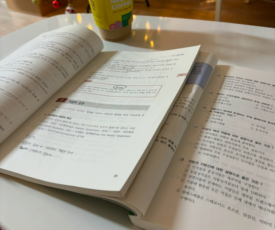 그리고 시험 전주에 기출문제집 6회짜리 하루에 한회차씩 해서 한권 더 풀었어요. 실제 시험이랑 비슷한 환경에서 풀려고 난생처음 스터디 카페도 가보고, 아침에 공부 시작할때 기출문제부터 시간체크해가면서 풀었습니다. 돌아보니 영양사 시험준비도 나름 재밌게 한 것 같아요.