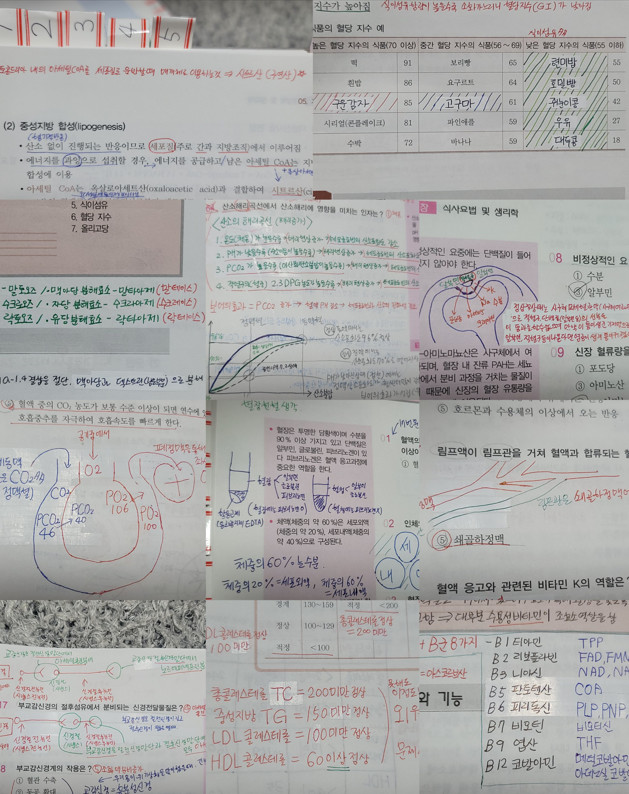 그리고 교수님들께서 설명해주신 내용을 최대한 교재에 적어두려고 노력했어요. 그래서 중간중간 강의 멈추고 필기하던 시간까지 생각하면 한 강의 듣는데 2시간 넘게 걸렸던듯 싶어요. 그래서 처음엔 진도가 빨리 나가지 않아서 힘들었지만 지금 지나고 보니 강의 보면서 멈추고 필기하고 했던게 중간중간 복습한 효과가 있었던듯 싶어요. 그리고 교재의 표에 이부분은 적어도 외워야 된다 싶으면 일부러 지우고 글씨를 크게 적어서 눈에 바로 들어오도록 수정했어요.